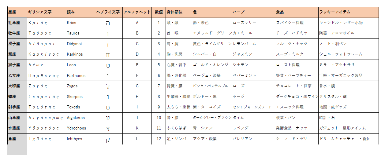 - カバラ・錬金術・占星術の照応早見表