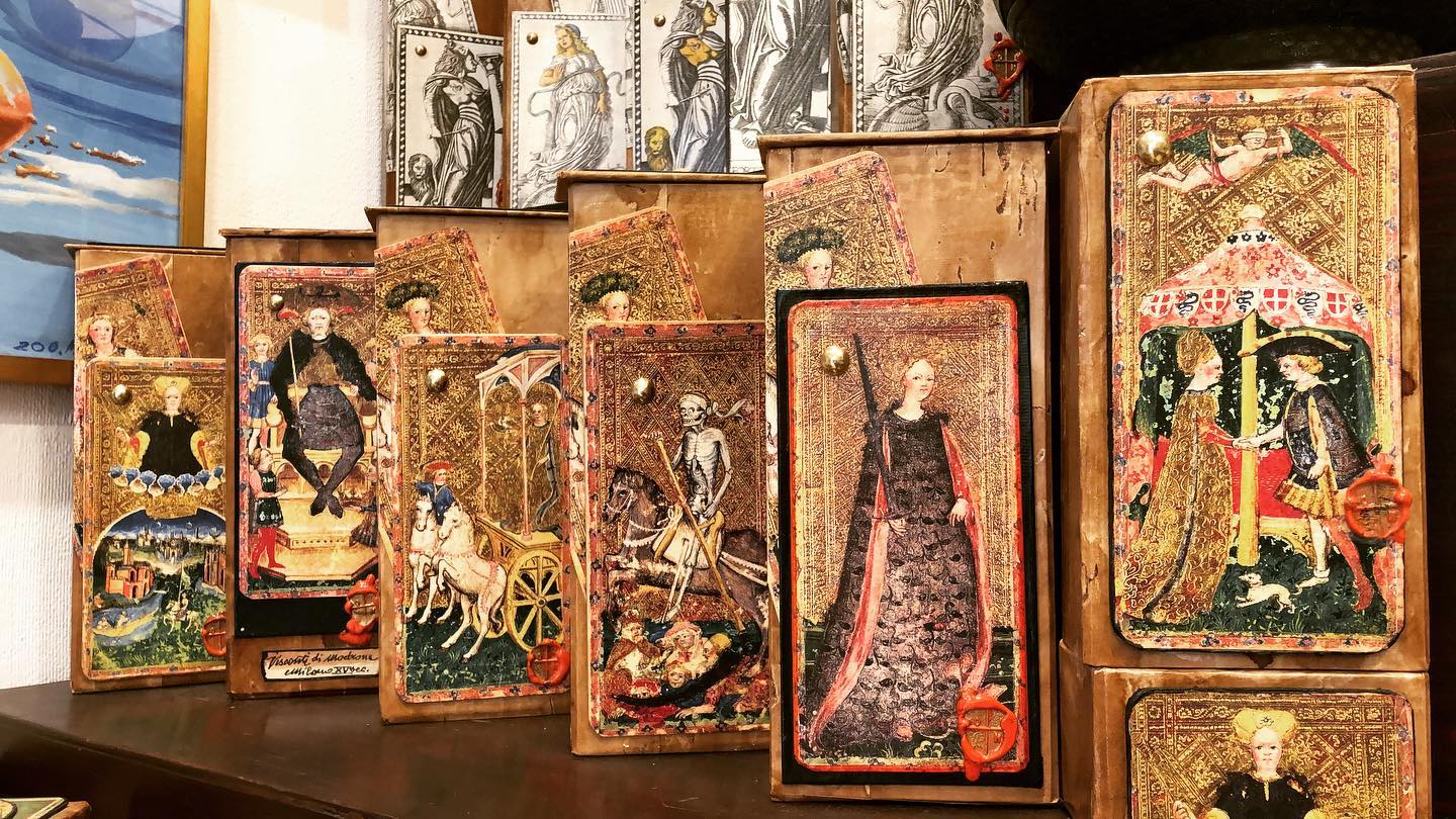 当時のタロットはテンペラ画という、画材に卵やハチミツなどを用いる手法で、厚いカードボードに描かれた油絵の類でした。